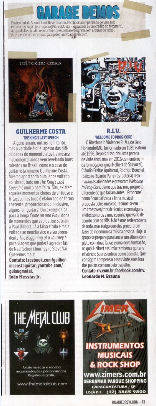 A nova proposta musical do R.I.V. Entitulada PROG-CORE chamou a atenção da maior revista de Heavy Metal do Brasil a RODIE CREW e na edição #226 houve uma chamada na seção GARAGE DEMOS que obteve uma excelente repercussão.